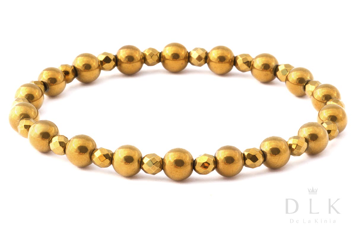 Bracelet “Golden Hematite” made of round and faceted gold-colored hematite balls. Hematite (Greek haema , blood ; haimatites , bloody ; in reference to the red color of this mineral after pulverization ) – common mineral, iron oxide. It is widespread in all major rock types.