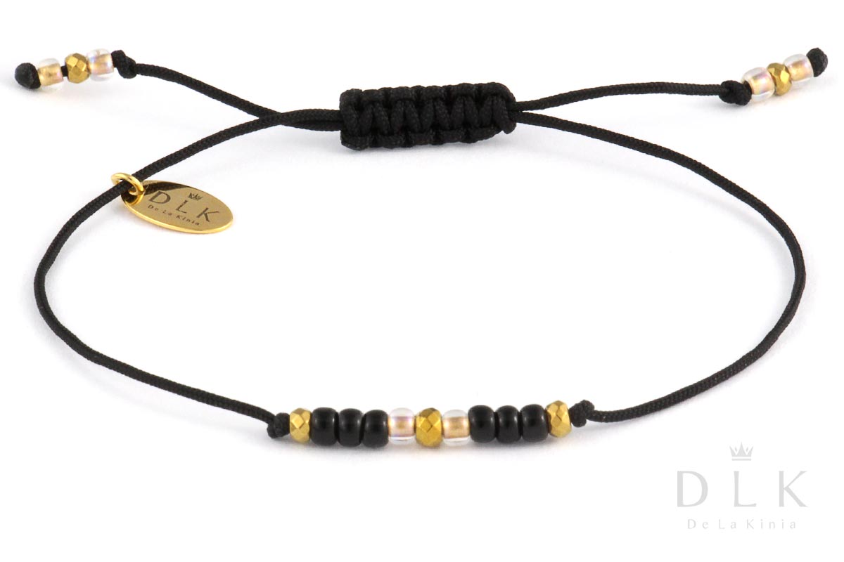 The bracelet “Black beads with golden hematite on a string” is a light, very feminine proposition from the spring-summer collection. Its uniqueness lies in its casual character and modest, yet elegant form. The bracelet has a DLK pendant made of gold-plated silver (925).