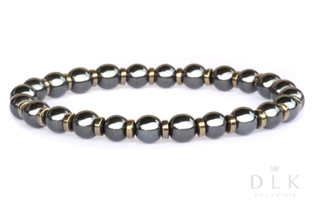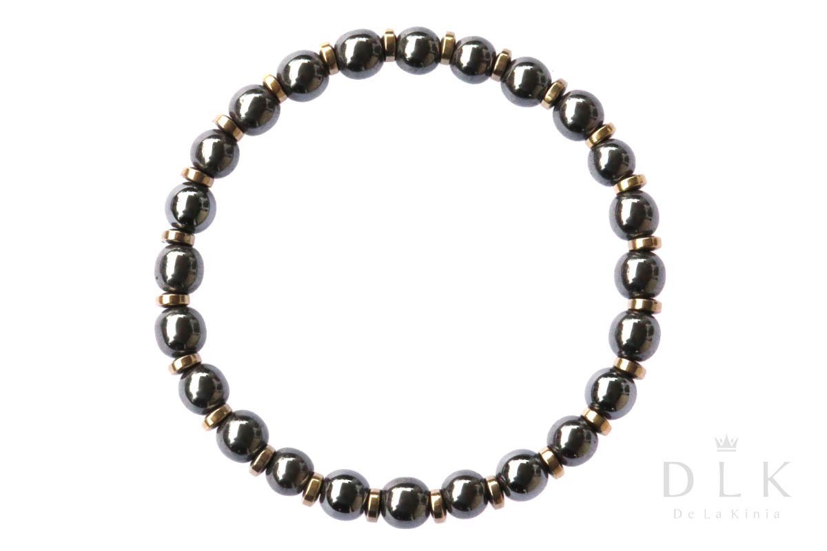 Bracelet “Hematite beads with spacers” made of hematite ball-shaped, dark metallic color, with gold-colored hematite spacers.