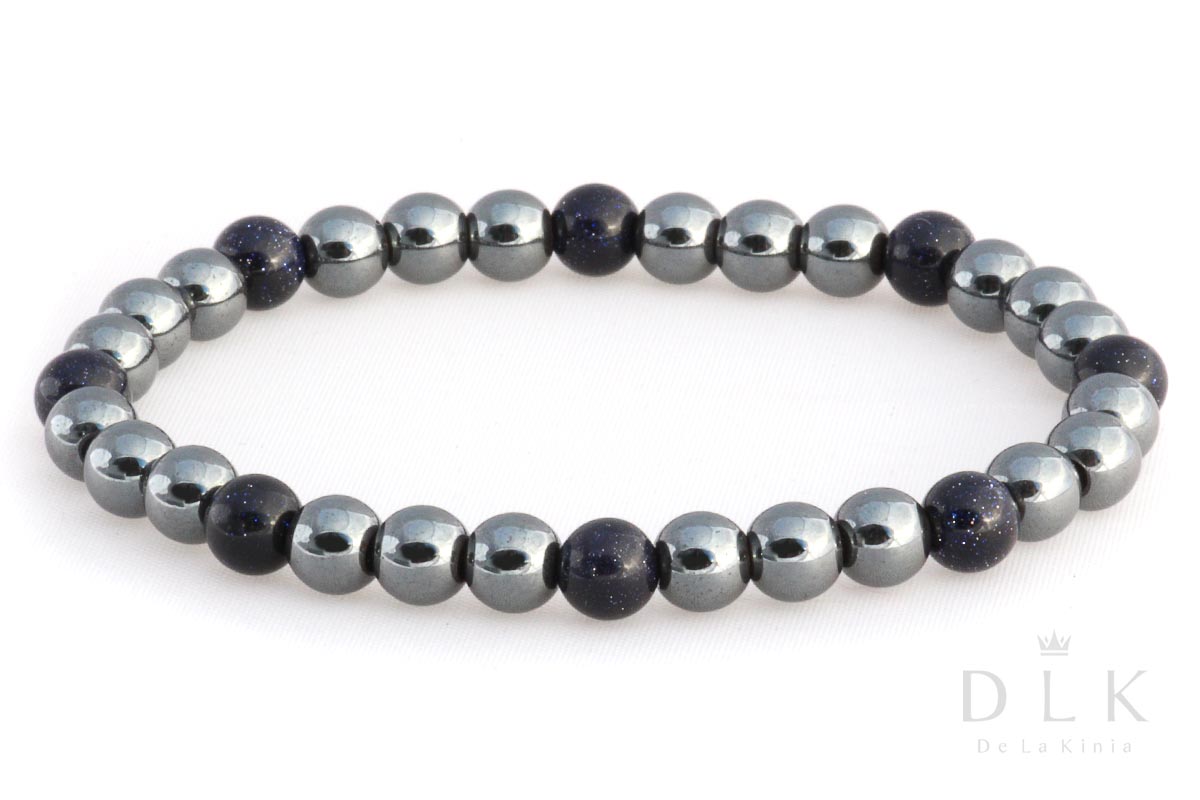 “Hematite with Night of Cairo” bracelet made of dark metallic hematite with balls of the Cairo Night stone in a shimmering navy blue color. Hematite (Greek haema (haima), blood ; haimatites , bloody ; in reference to the red color of this mineral after its pulverization) – a common mineral, iron oxide. It is widespread in all major rock types.