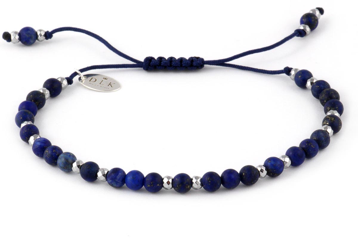 The bracelet “Lapis lazuli with hematite on a string” is made of deep navy blue matte lapis lazuli stone beads (with delicate golden veins in its structure) and with faceted silver hematite plates, mounted on a navy blue cord.
