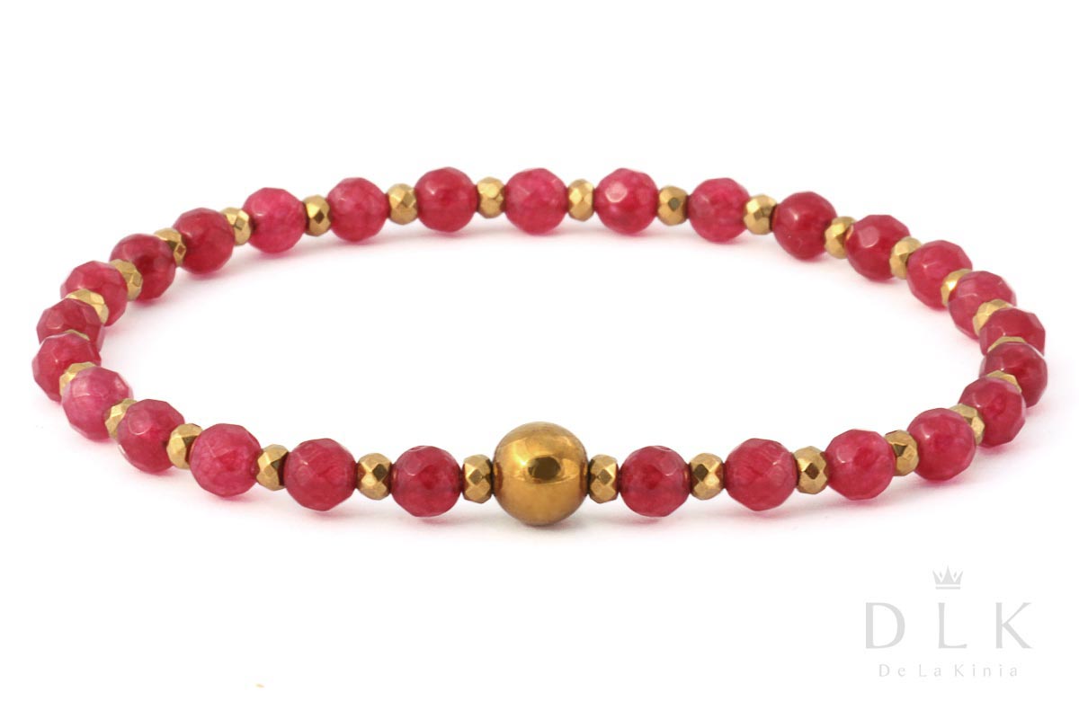 Bracelet “Red agates with golden ball” made of faceted agate balls in fuchsia and golden hematite. Agate is a semi-precious mineral. The name comes from the Achates River (today Dirillo) in southern Sicily, Italy, where it was mined since antiquity. Agate is considered a stone helpful in the treatment of the digestive system, stomach ulcers, female ailments and infertility. It also affects our psyche. They balance emotions, relieve stress, and facilitate taking up challenges and discovering yourself.