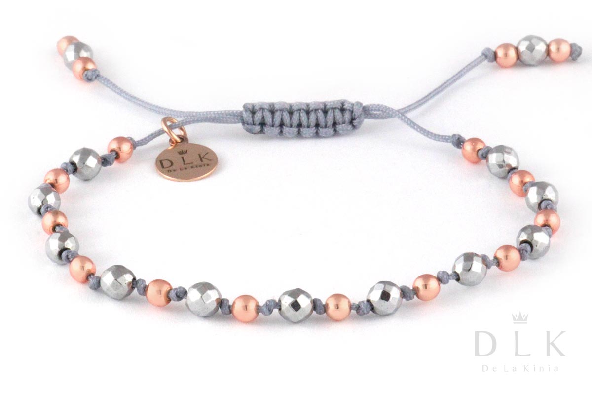 The bracelet is made of shiny, faceted silver hematite balls and hematite balls in Rose Gold (rose gold) color, mounted on a gray string.