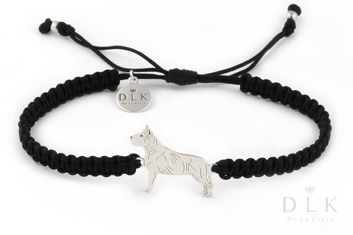 The bracelet is made of a connector in the shape of a dog’s silhouette, of silver (925) and a strap of black, braided string – macrame. The bracelet is additionally decorated with silver elements – balls and a DLK pendant made of pure silver (attempt at 925).