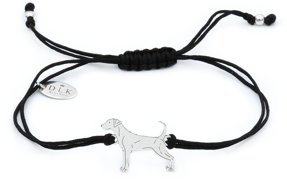 The bracelet is made of a silver dog-shaped connector (attempt at 925) and a black string. The string bracelet is additionally decorated with silver elements – balls and a DLK pendant made of pure silver (attempt at 925).