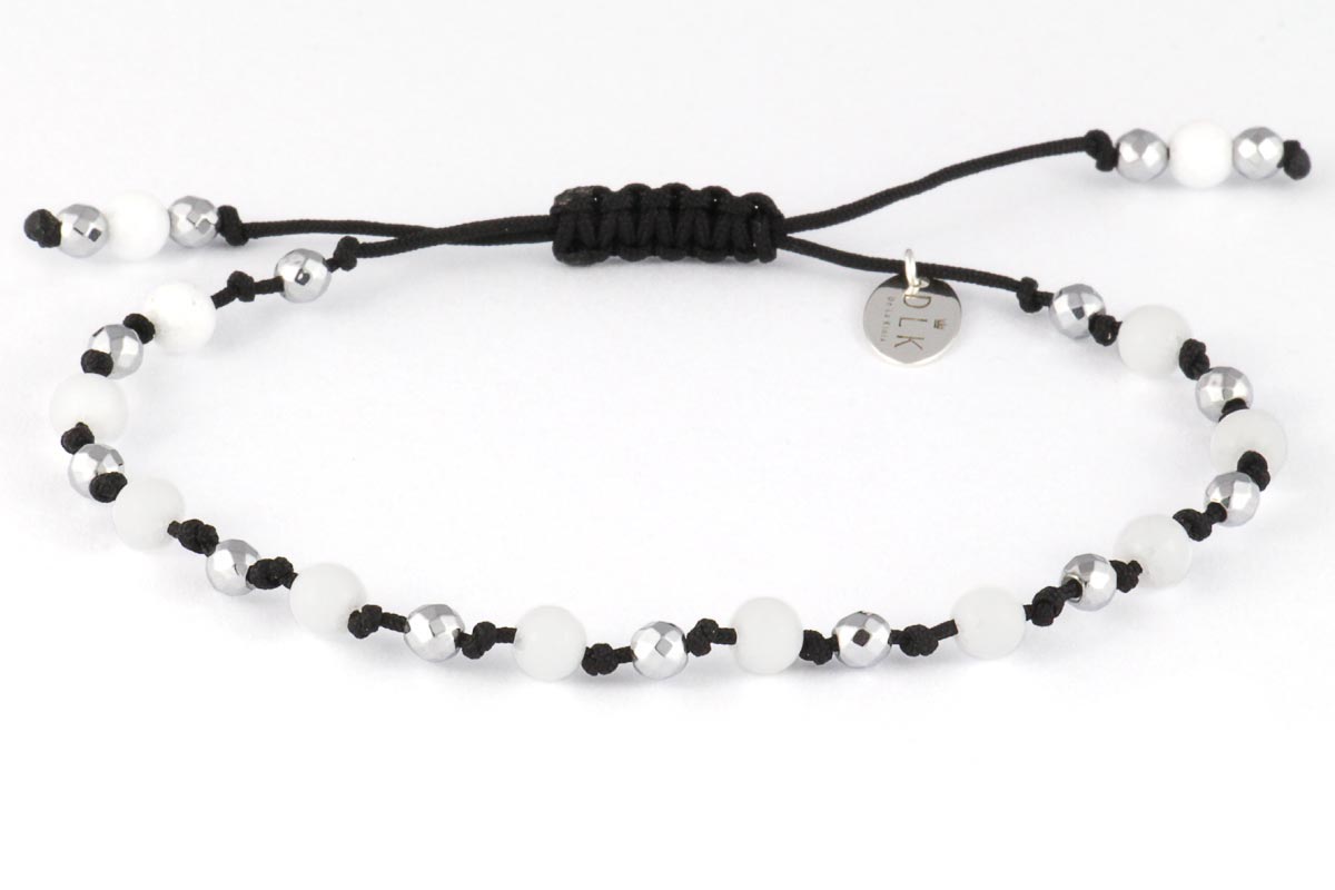 The bracelet is made of white jade balls and silver faceted hematite balls embedded on a black string.