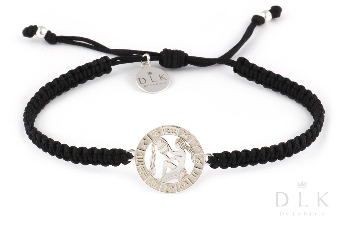 The bracelet with Aquarius is made of a black braided string, the sign of the zodiac, the DLK pendant and the balls at the ends of the string are made of sterling silver.