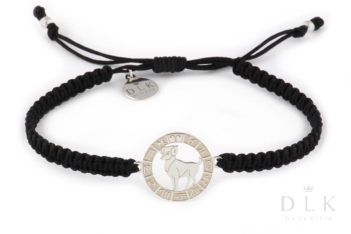 The Aries bracelet is made of a black braided string, the sign of the zodiac, the DLK pendant and the balls at the ends of the string are made of sterling silver.