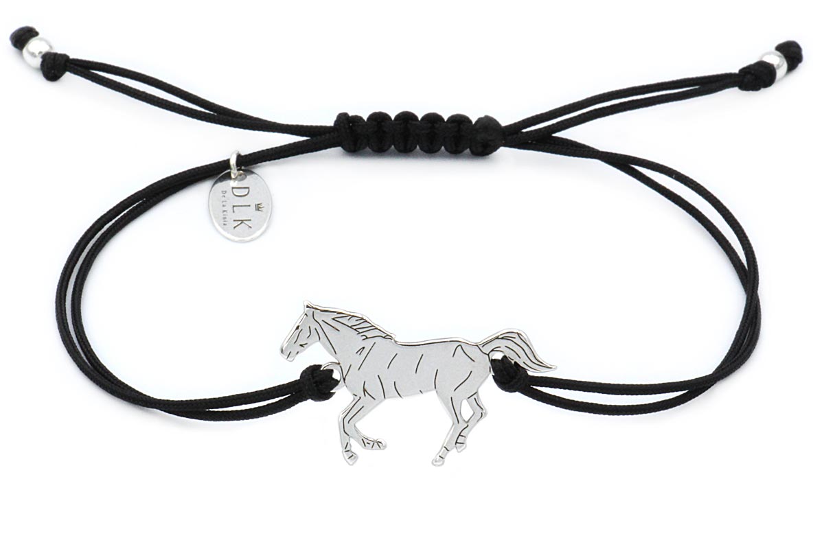 The bracelet is made of a black string. The bracelet is decorated with silver elements (sterling silver): a galloping horse, DLK pendant and balls at the ends of the string.