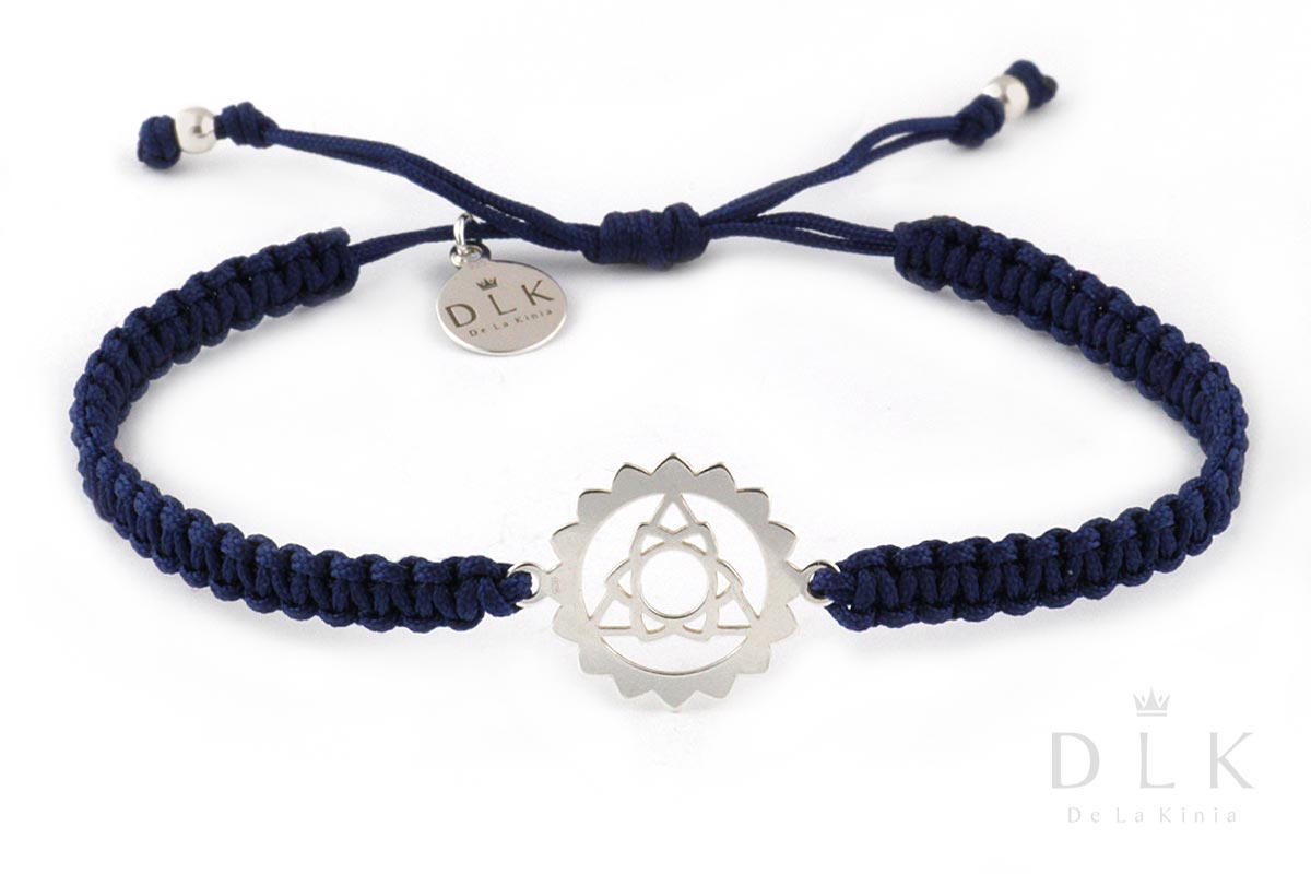 The bracelet is made of a braided cord in navy blue color, the symbol of the throat chakra, DLK pendant and balls at the ends of the string are made of 925 silver.