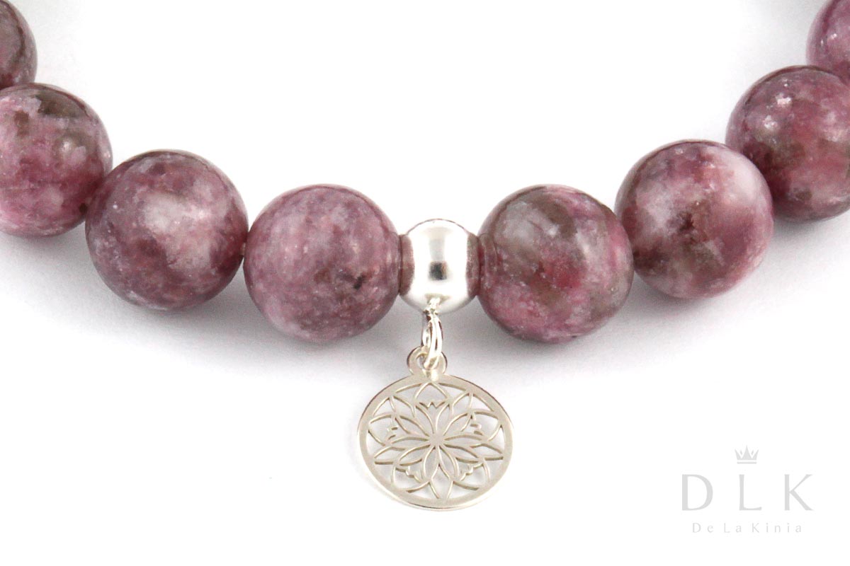 Bracelet “Lepidolit with a pendant” made of smooth lepidolite balls in the color of light cyclamen (pink with a violet shade) and silver (attempt 925) rosette-shaped pendants.