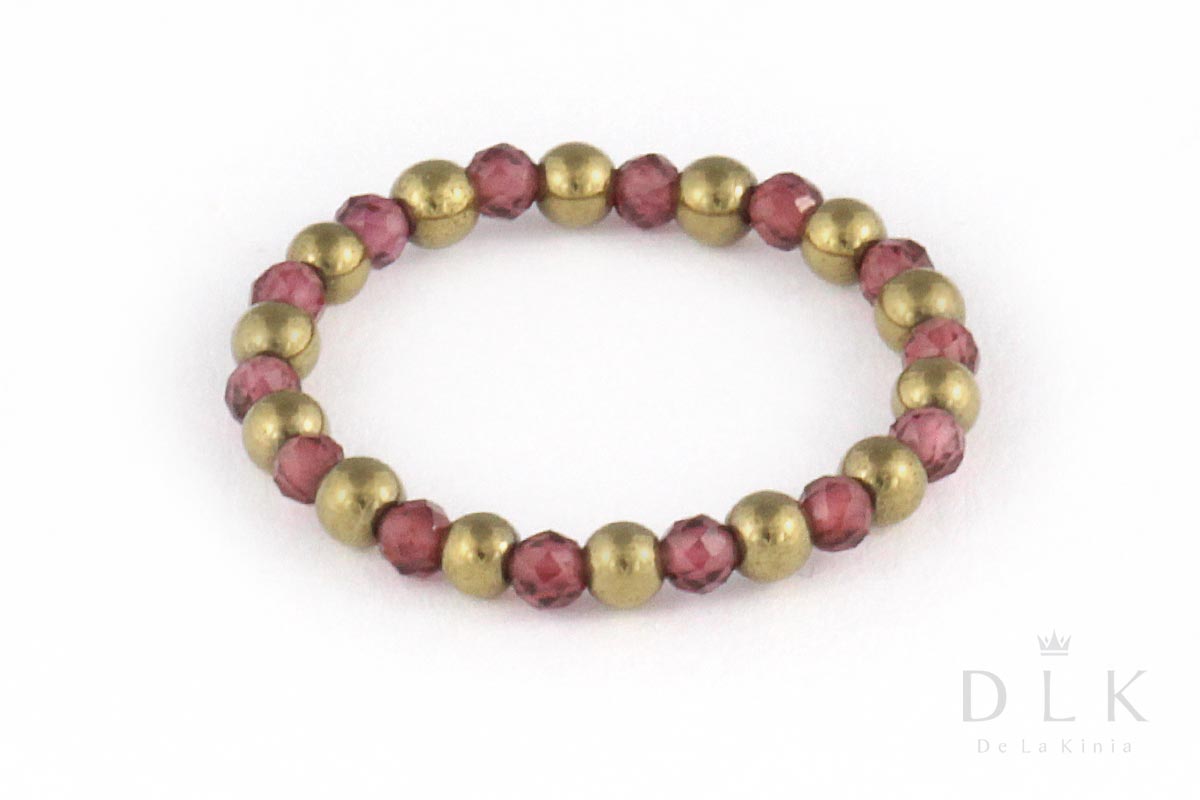 Pierścionek elastyczny z granatów i jasno-złotych hematytów wykonany jest z fasetowanych granatów w kolorze ciemnej wiśni i błyszczących, jasno-złotych kulek hematytu, osadzonych naprzemiennie na gumce jubilerskiej.