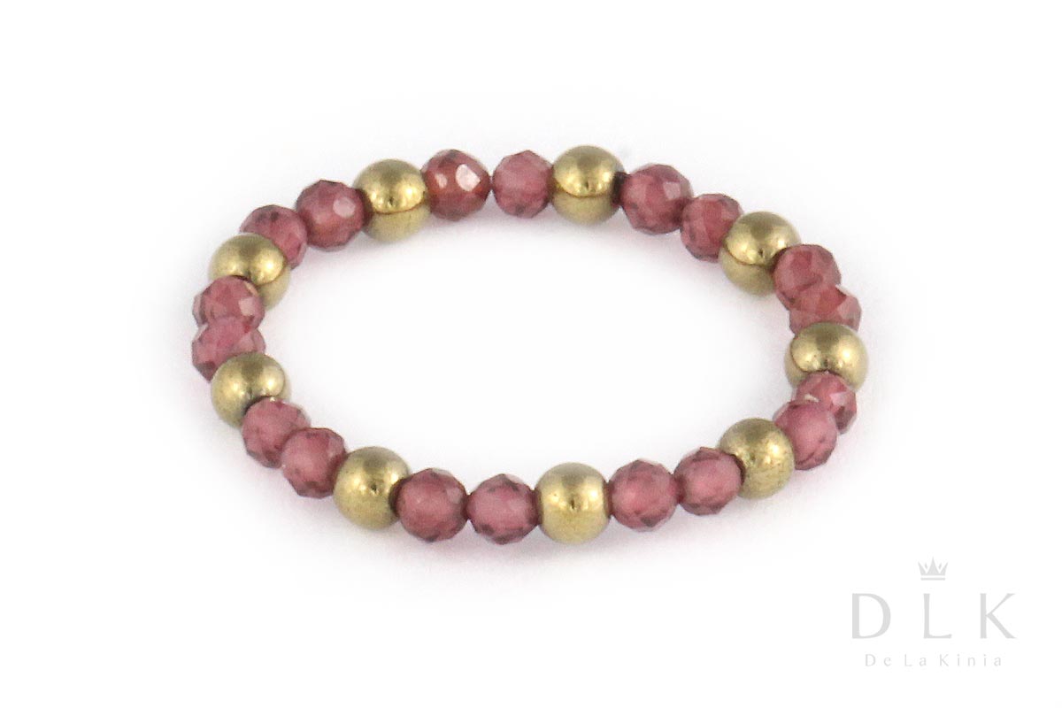 Pierścionek elastyczny z granatów z dodatkiem jasno-złotych hematytów wykonany jest z fasetowanych granatów w kolorze ciemnej wiśni i błyszczących, jasno-złotych kulek hematytu, osadzonych na gumce jubilerskiej.