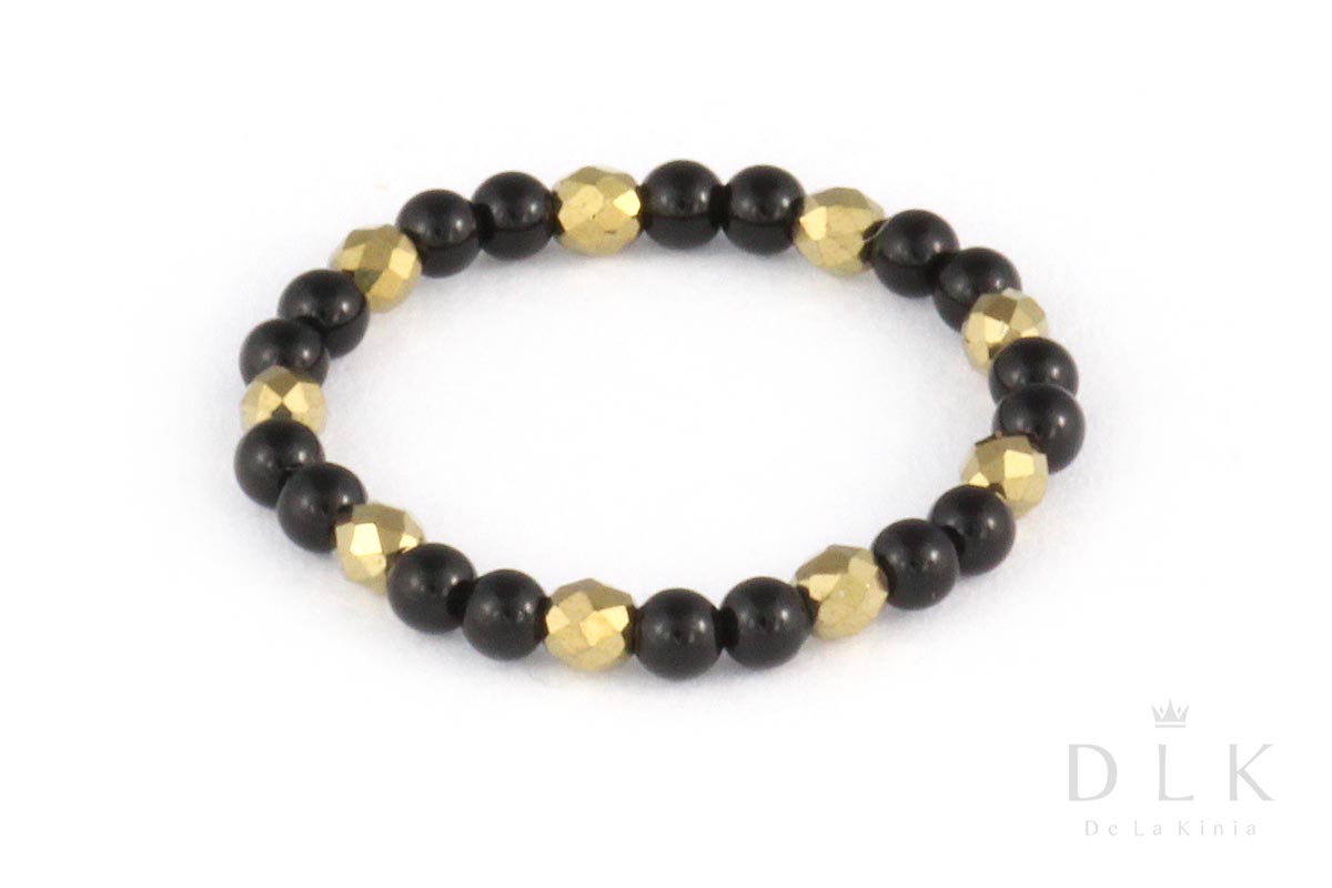 Pierścionek elastyczny z onyksów i jasno-złotych hematytów wykonany jest z czarnych, błyszczących kulek onyksu i jasno-złotych, fasetowanych kulek hematytu, osadzonych na gumce jubilerskiej.