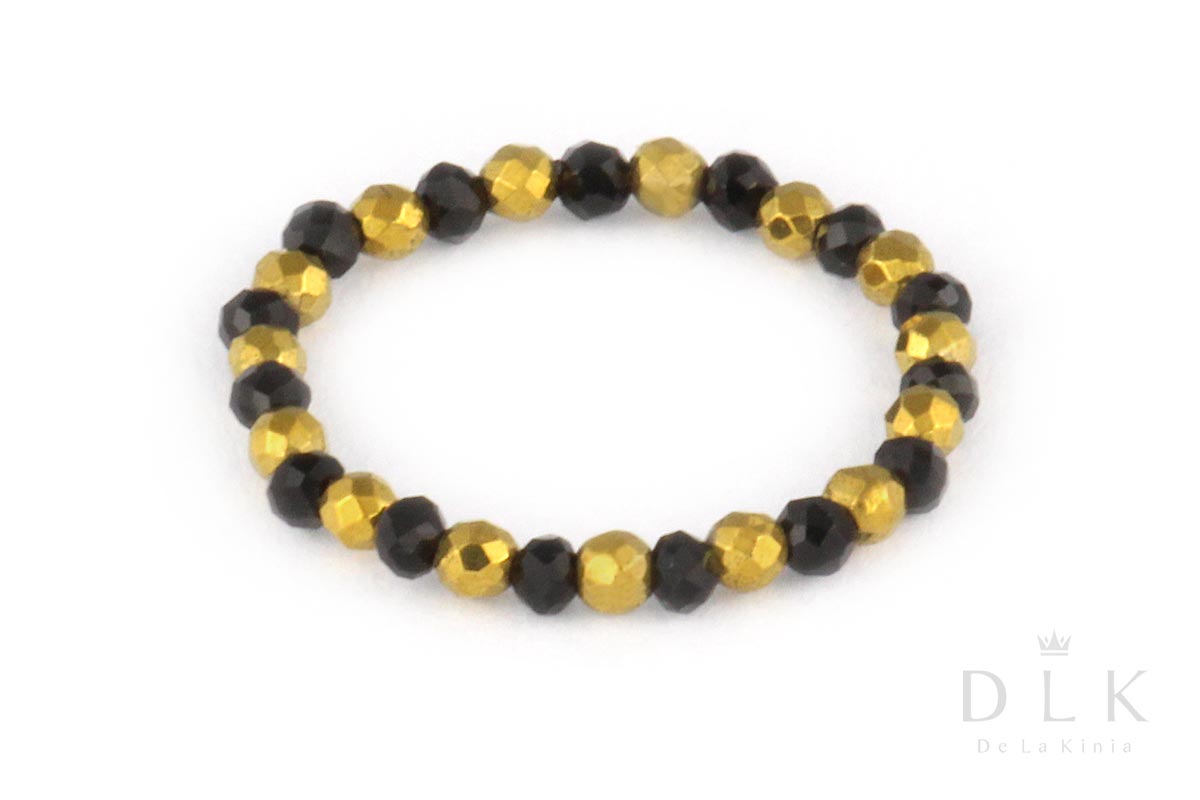 Pierścionek elastyczny ze spineli i złotych hematytów wykonany jest z czarnych, fasetowanych spineli i złotych, fasetowanych kulek hematytu, osadzonych naprzemiennie na gumce jubilerskiej.