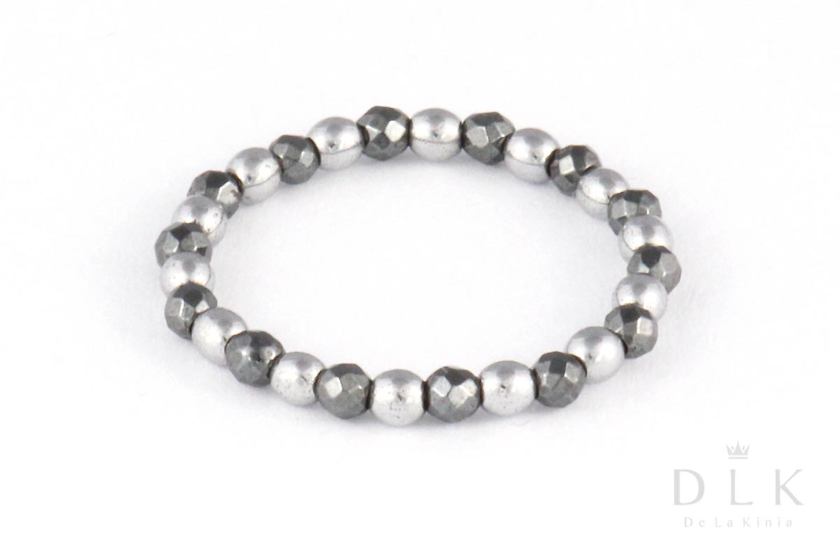 Pierścionek elastyczny ze srebrnych i czarnych hematytów wykonany jest z błyszczących srebrnych i grafitowych fasetowanych kulek hematytu osadzonych naprzemiennie na gumce jubilerskiej.